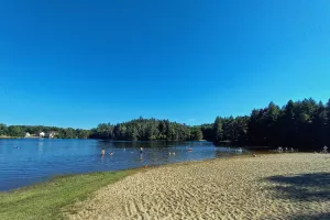 Lac de 33 ha : baignade surveillée de mi-juillet à mi-août de 14h à 19h, pêche, jeux pour enfants, ainsi que des tables...